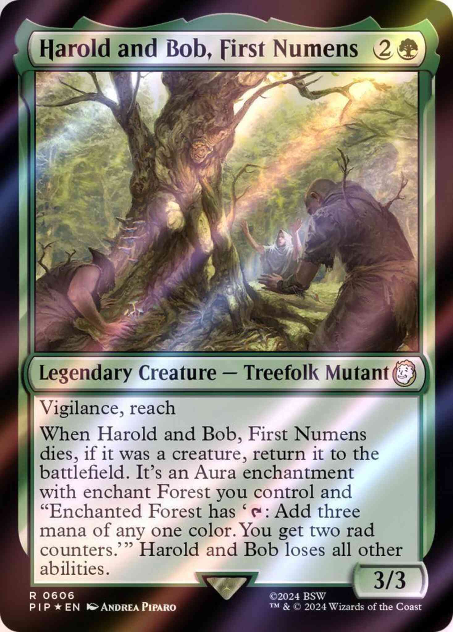 Vigilance, reach When Harold and Bob, First Numens dies, if it was a creature, return it to the battlefield. It's an Aura enchantment with enchant Forest you control and "Enchanted Forest has '{T}: Add three mana of any one color. You get two rad counters.'" Harold and Bob loses all other abilities.