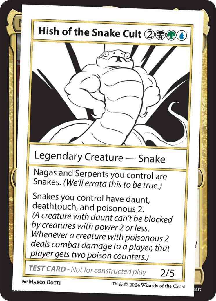 Card Text: Nagas and Serpents you control are Snakes. (We'll errata this to be true.) Snakes you control have daunt, deathtouch, and poisonous 2. (A creature with daunt can't be blocked by creatures with power 2 or less. Whenever a creature with poisonous 2 deals combat damage to a player, that player gets two poison counters.)
