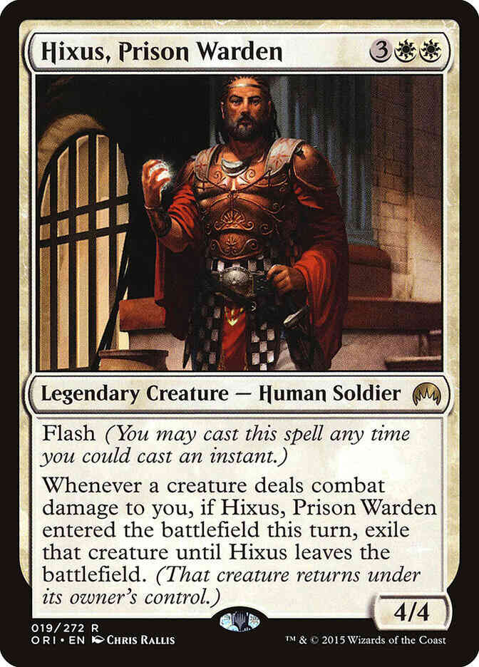 Card Text: Flash (You may cast this spell any time you could cast an instant.) Whenever a creature deals combat damage to you, if Hixus, Prison Warden entered the battlefield this turn, exile that creature until Hixus leaves the battlefield. (That creature returns under its owner's control.)