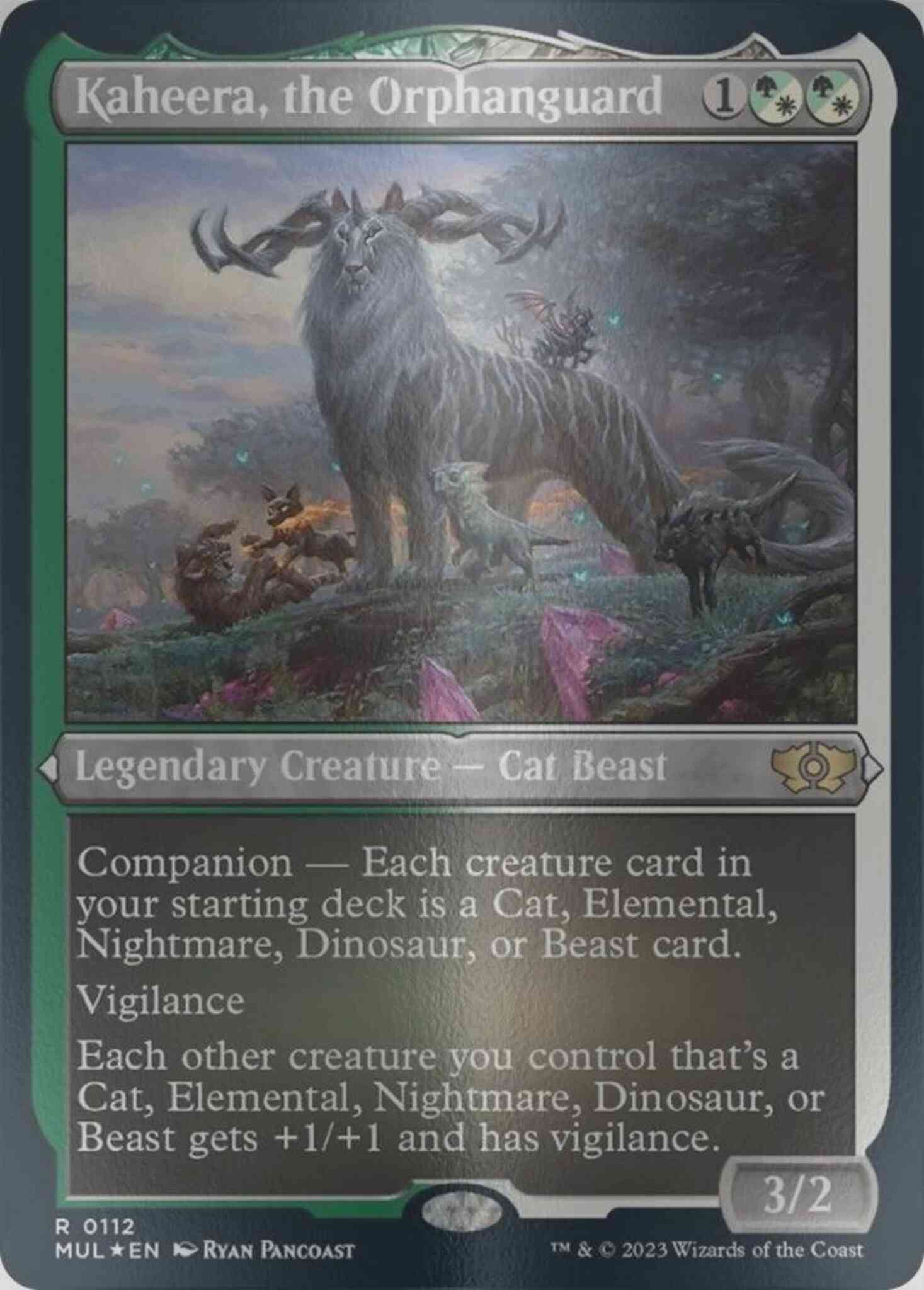 Card Text: Companion — Each creature card in your starting deck is a Cat, Elemental, Nightmare, Dinosaur, or Beast card. (If this card is your chosen companion, you may put it into your hand from outside the game for {3} any time you could cast a sorcery.) Vigilance Each other creature you control that's a Cat, Elemental, Nightmare, Dinosaur, or Beast gets +1/+1 and has vigilance.