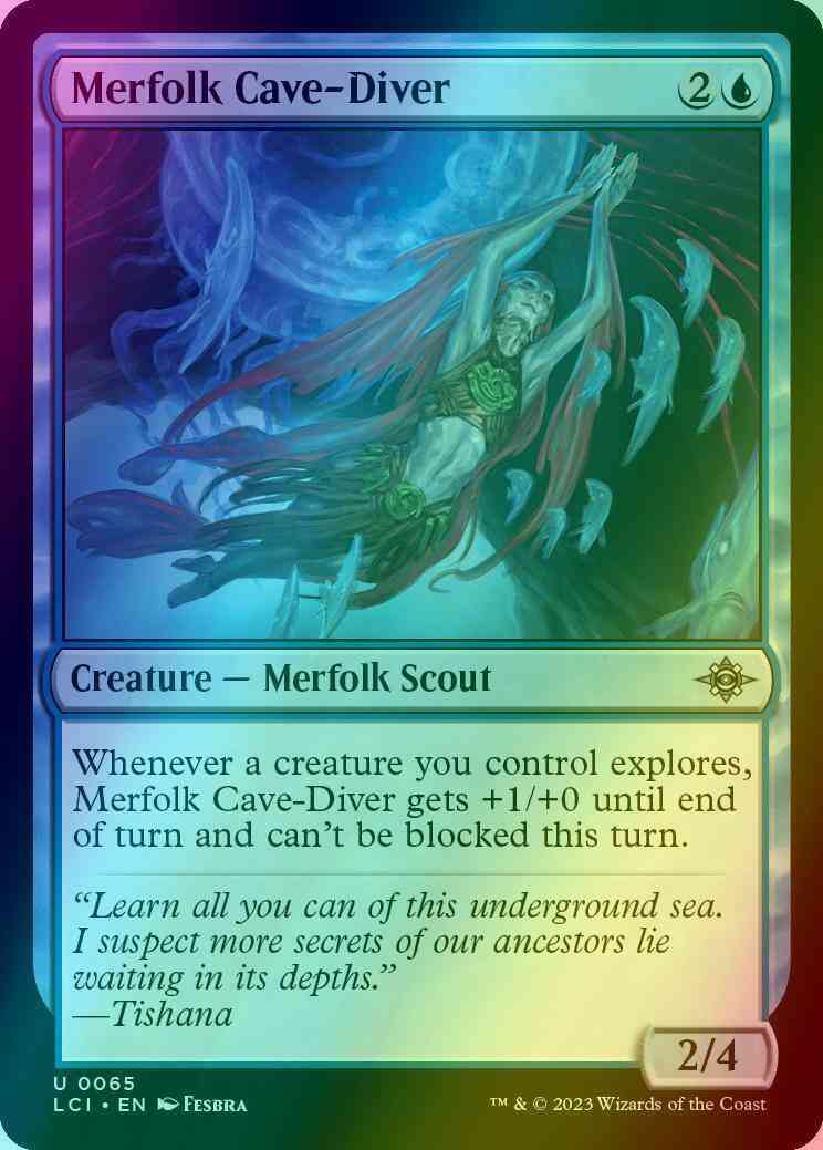 Whenever a creature you control explores, Merfolk Cave-Diver gets +1/+0 until end of turn and can't be blocked this turn.