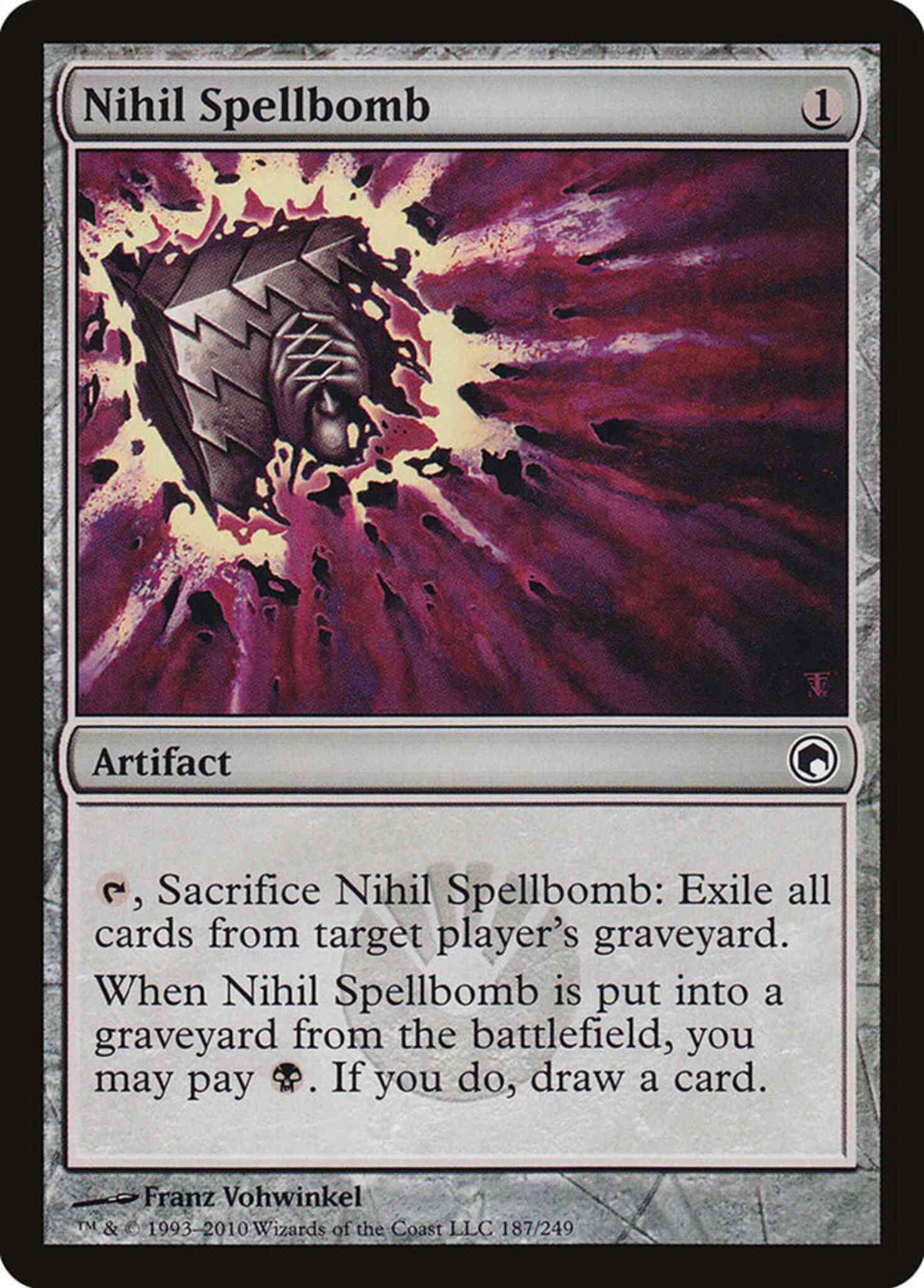 Card Text: {T}, Sacrifice Nihil Spellbomb: Exile all cards from target player's graveyard. When Nihil Spellbomb is put into a graveyard from the battlefield, you may pay {B}. If you do, draw a card.