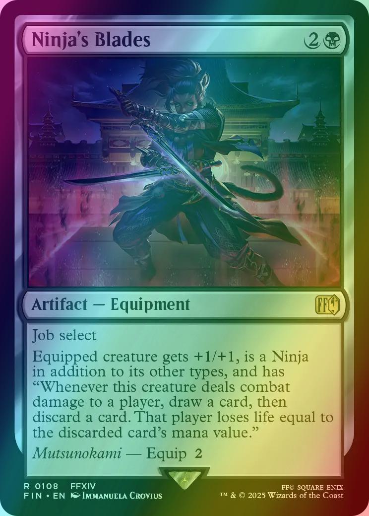 Job select Equipped creature gets +1/+1, is a Ninja in addition to its other types, and has "Whenever this creature deals combat damage to a player, draw a card, then discard a card. That player loses life equal to the discarded card's mana value." Mutsunokami — Equip {2}