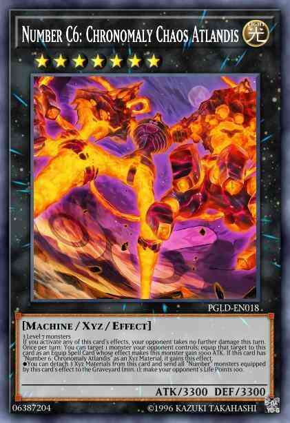 Card Text: 3 Level 7 monsters If you activate any of this card's effects, your opponent takes no further damage this turn. Once per turn: You can target 1 monster your opponent controls; equip that target to this card as an Equip Spell Card whose effect makes this card gain 1000 ATK. If this card has "Number 6: Chronomaly Atlandis" as an Xyz Material, it gains this effect. ● You can detach 3 Xyz Materials from this card and send all "Number" monsters equipped by this card's effect to the Graveyard (min. 1); make your opponent's Life Points 100.