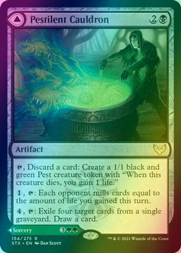 Card Text: {T}, Discard a card: Create a 1/1 black and green Pest creature token with "When this creature dies, you gain 1 life." {1}, {T}: Each opponent mills cards equal to the amount of life you gained this turn. {4}, {T}: Exile four target cards from a single graveyard. Draw a card.