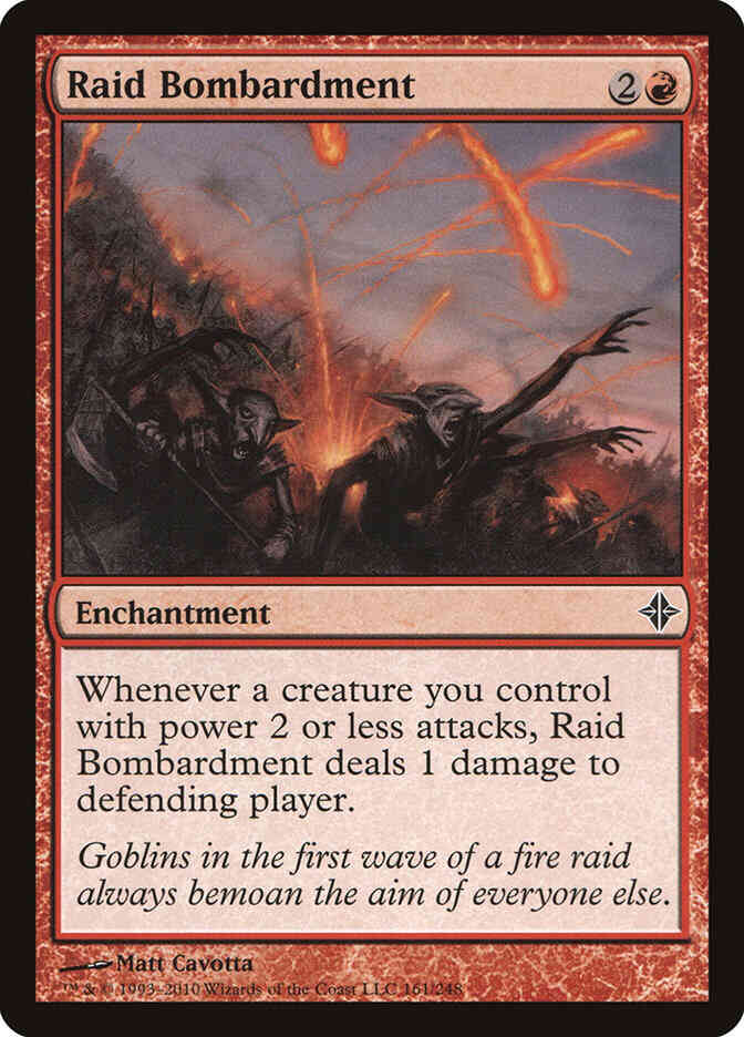 Card Text: Whenever a creature you control with power 2 or less attacks, Raid Bombardment deals 1 damage to the player or planeswalker that creature is attacking.