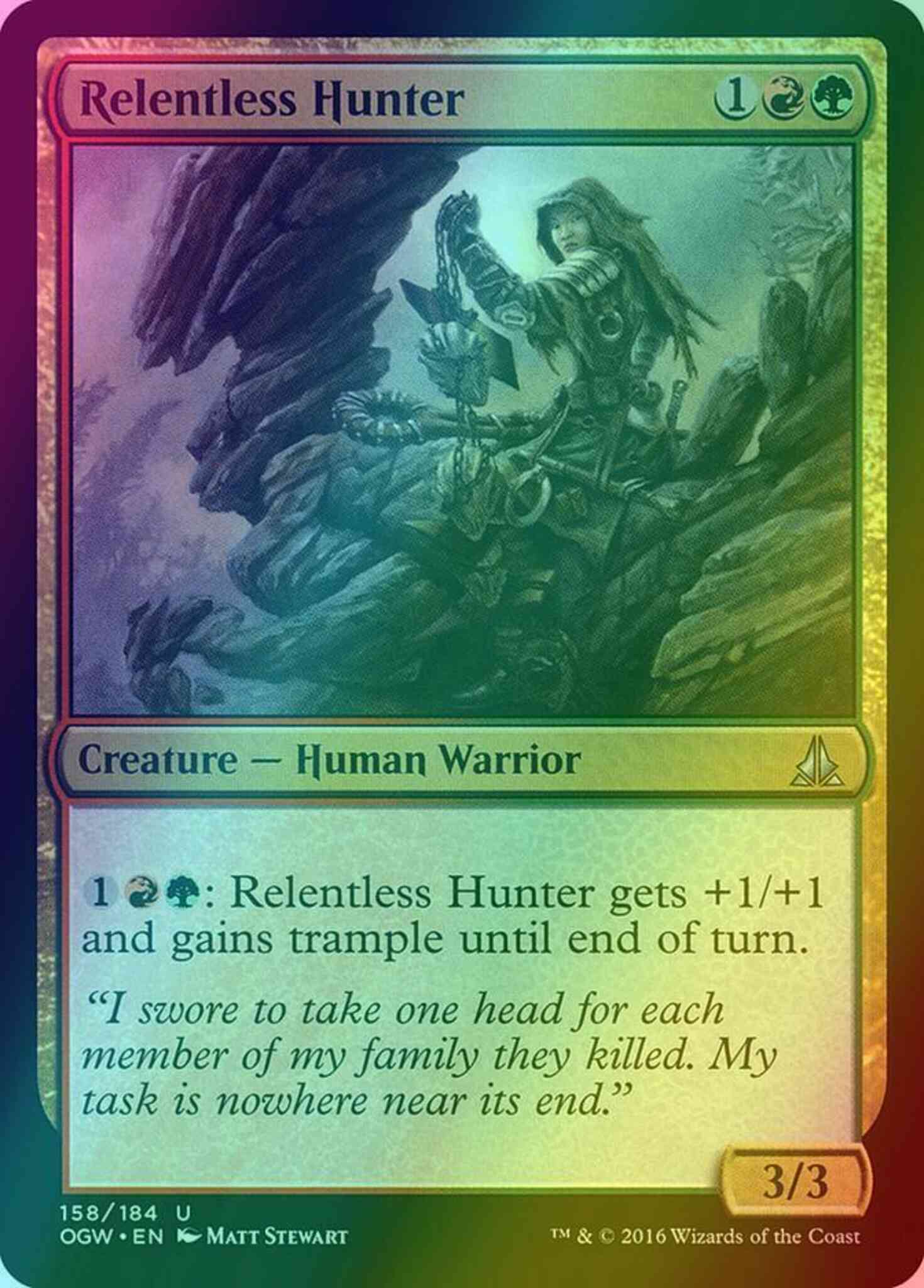 {1}{R}{G}: Relentless Hunter gets +1/+1 and gains trample until end of turn.