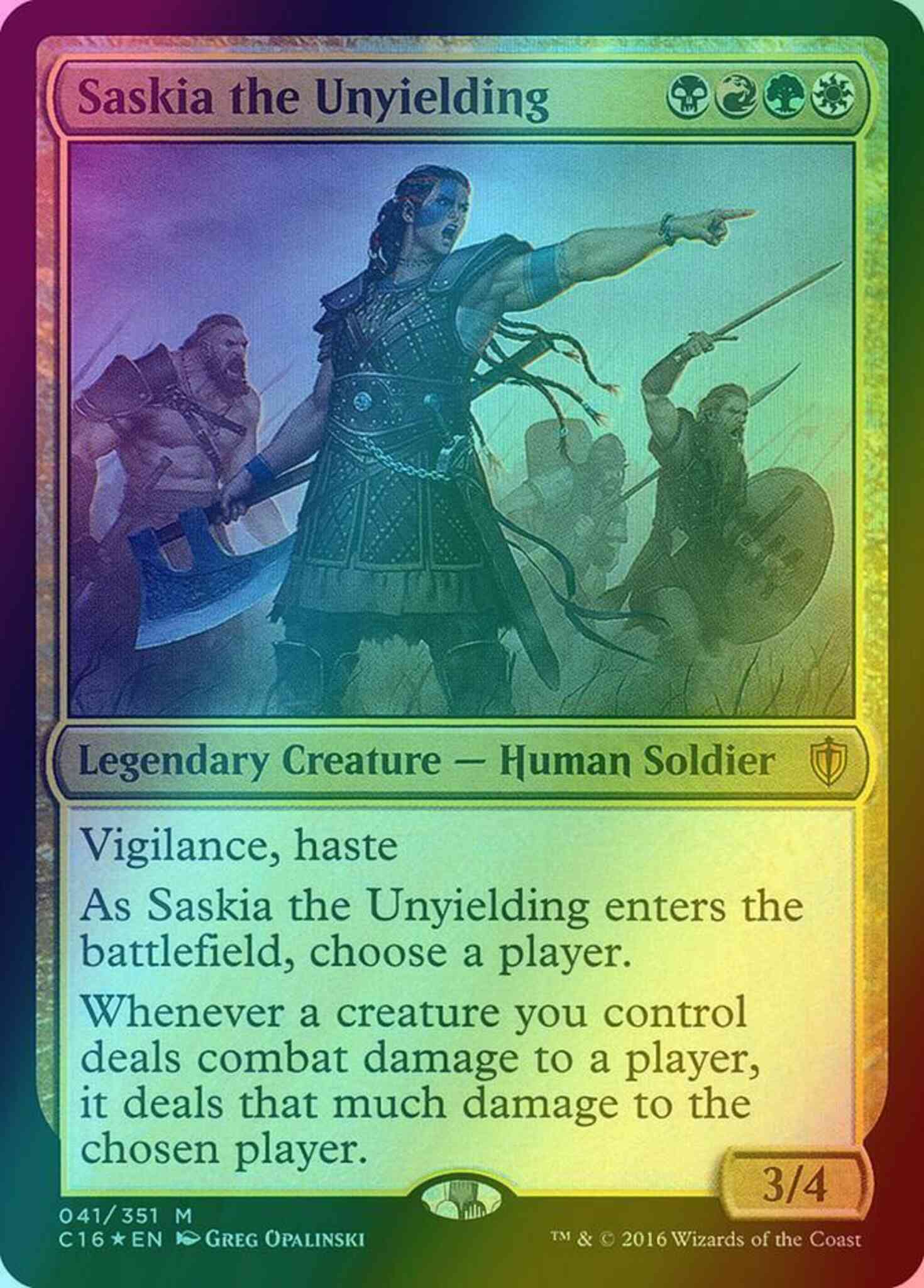 Card Text: Vigilance, haste As Saskia the Unyielding enters the battlefield, choose a player. Whenever a creature you control deals combat damage to a player, it deals that much damage to the chosen player.