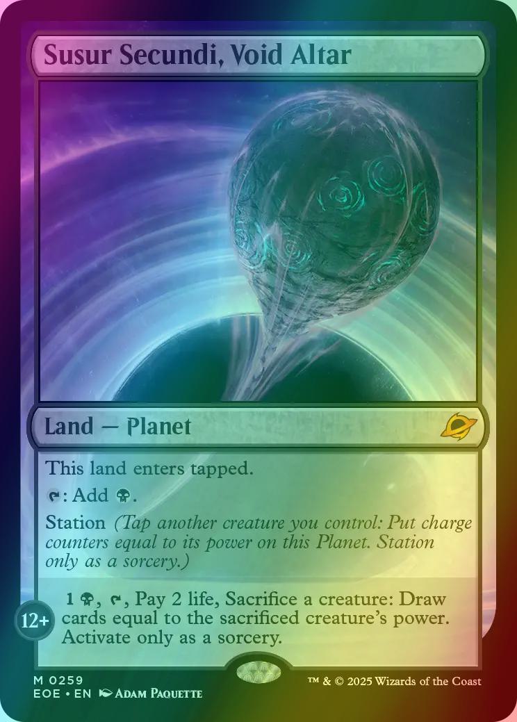 This land enters tapped. {T}: Add {B}. Station (Tap another creature you control: Put charge counters equal to its power on this Planet. Station only as a sorcery.) STATION 12+ {1}{B}, {T}, Pay 2 life, Sacrifice a creature: Draw cards equal to the sacrificed creature's power. Activate only as a sorcery.
