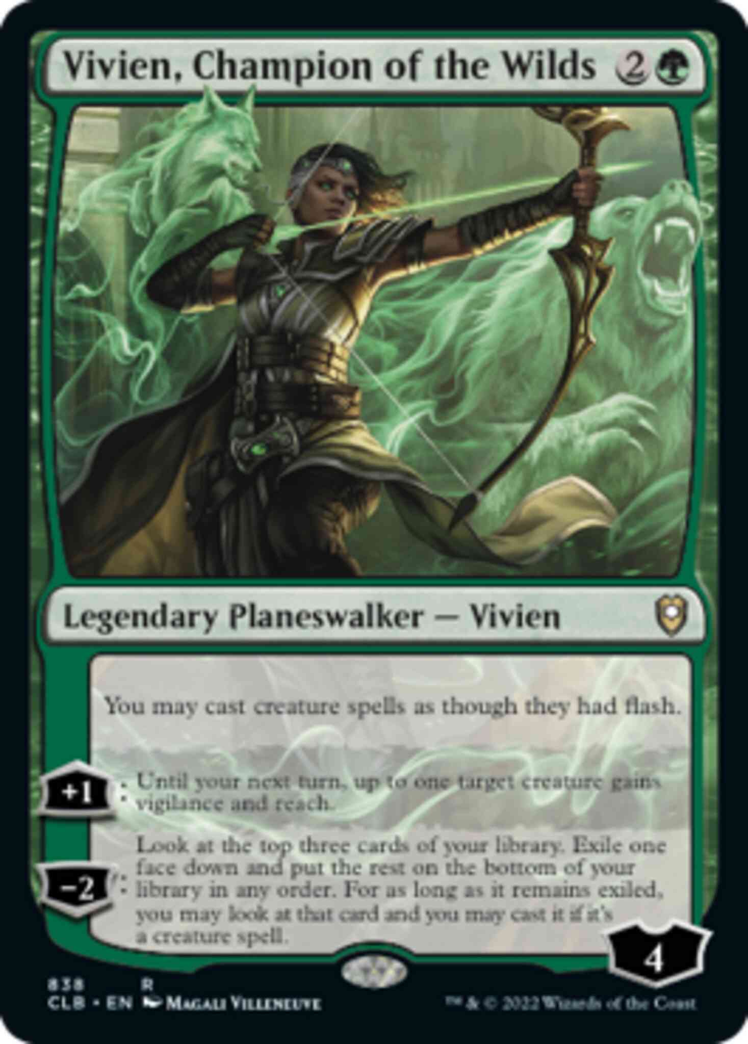 Card Text: You may cast creature spells as though they had flash. [+1]: Until your next turn, up to one target creature gains vigilance and reach. [−2]: Look at the top three cards of your library. Exile one face down and put the rest on the bottom of your library in any order. For as long as it remains exiled, you may look at that card and you may cast it if it's a creature spell.