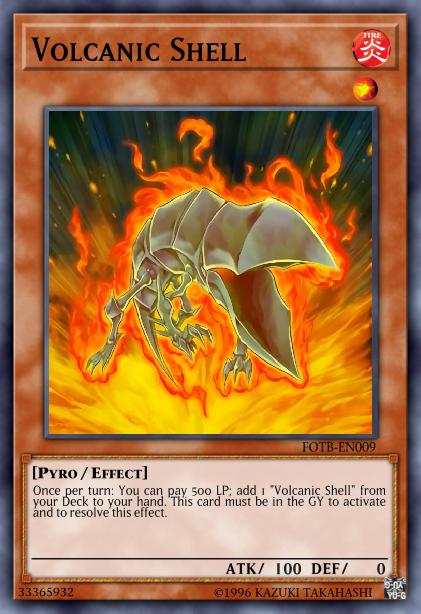 Once per turn: You can pay 500 Life Points; add 1 "Volcanic Shell" from your Deck to your hand. This card must be in the Graveyard to activate and to resolve this effect.