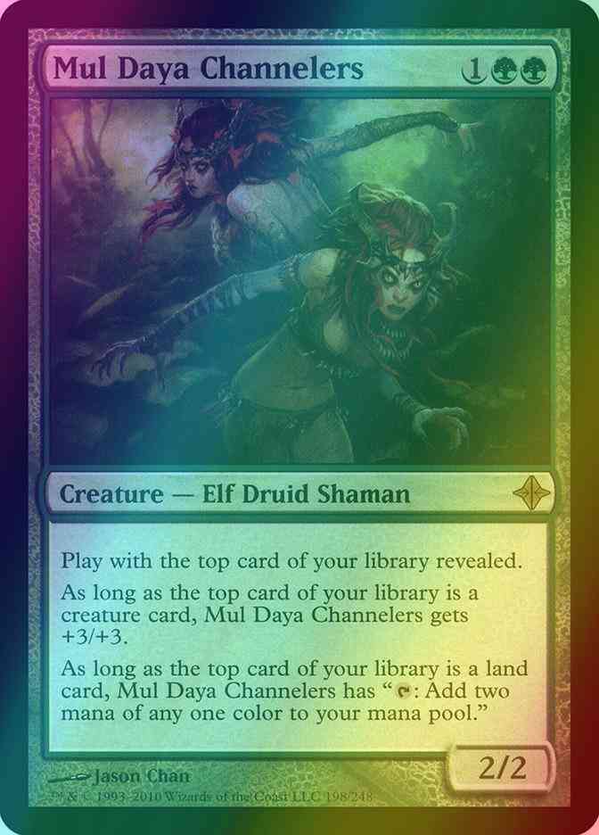 Tant que la carte du dessus de votre bibliothèque est une carte de terrain, les Canalisatrices de Mul Daya ont « {T} : Ajoutez deux manas d'une même couleur de votre choix à votre réserve. »