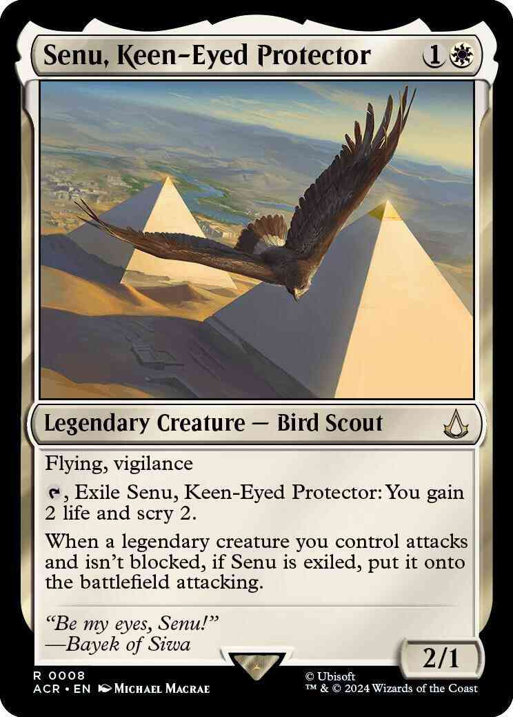 Vol, vigilance {T}, exilez Senu, protectrice à la vue perçante : Vous gagnez 2 points de vie et regard 2. Quand une créature légendaire que vous contrôlez attaque et n'est pas bloquée, si Senu est exilée, mettez-la sur le champ de bataille, attaquante.