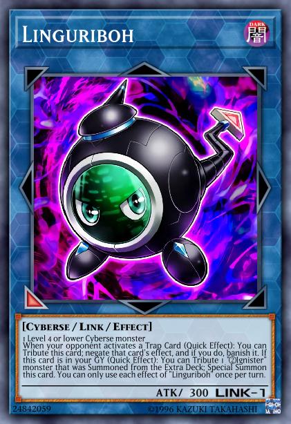 Lorsque votre adversaire active une Carte Piège (Effet Rapide) : vous pouvez Sacrifier cette carte ; annulez l'effet de carte, et si vous le faites, bannissez-la. Si cette carte est dans votre Cimetière (Effet Rapide) : vous pouvez Sacrifier 1 monstre "@Ignister" qui a été Invoqué depuis l'Extra Deck ; Invoquez Spécialement cette carte. Vous ne pouvez utiliser chaque effet de "Linguriboh" qu'une fois par tour.