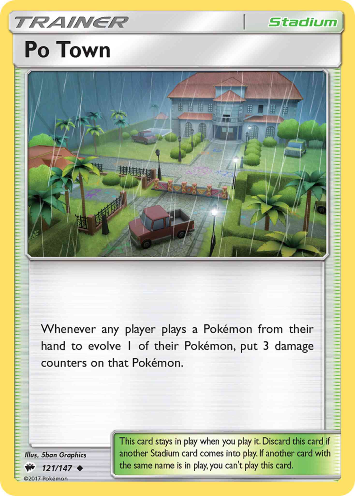 Texte de la carte: Chaque fois qu’un joueur joue un Pokémon de sa main pour faire évoluer l’un de ses Pokémon, placez 3 marqueurs de dégâts sur ce Pokémon.