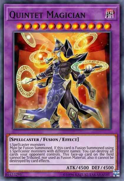 Uniquement Invocable par Fusion. Si cette carte est Invoquée par Fusion en utilisant 5 monstres Magicien de noms différents : vous pouvez détruire toutes les cartes contrôlées par votre adversaire. Cette carte face recto sur le Terrain ne peut être ni Sacrifiée ni utilisée comme Matériel Fusion, et aussi, elle ne peut pas être détruite par des effets de carte.