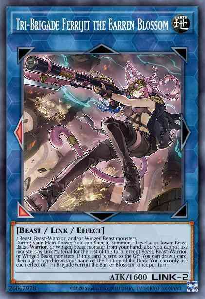 Texte de la carte: 2 monstres Bête, Bête-Guerrier et/ou Bête Ailée Durant votre Main Phase : vous pouvez Invoquer Spécialement 1 monstre Bête, Bête-Guerrier ou Bête Ailée de max. Niveau 4 depuis votre main, et aussi, vous ne pouvez pas utiliser de monstres (monstres Bête, Bête-Guerrier ou Bête Ailée exclus) comme Matériel Lien le reste de ce tour. Si cette carte est envoyée au Cimetière : vous pouvez piocher 1 carte, puis placez 1 carte depuis votre main au-dessous du Deck. Vous ne pouvez utiliser chaque effet de "Ferrijit Tri-Brigade la Floraison Aride" qu'une fois par tour.