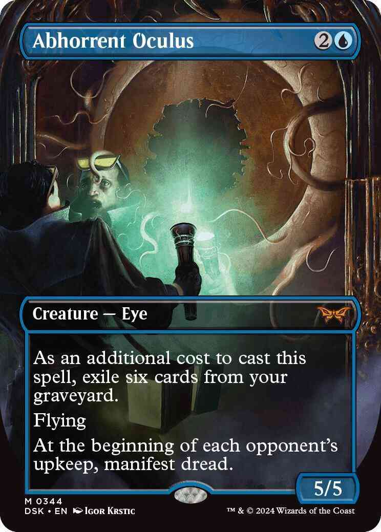 Card Text: As an additional cost to cast this spell, exile six cards from your graveyard. Flying At the beginning of each opponent's upkeep, manifest dread. (Look at the top two cards of your library. Put one onto the battlefield face down as a 2/2 creature and the other into your graveyard. Turn it face up any time for its mana cost if it's a creature card.)