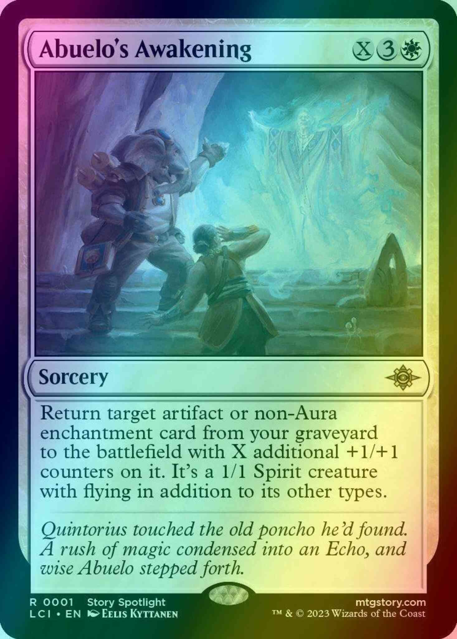 Card Text: Return target artifact or non-Aura enchantment card from your graveyard to the battlefield with X additional +1/+1 counters on it. It's a 1/1 Spirit creature with flying in addition to its other types.