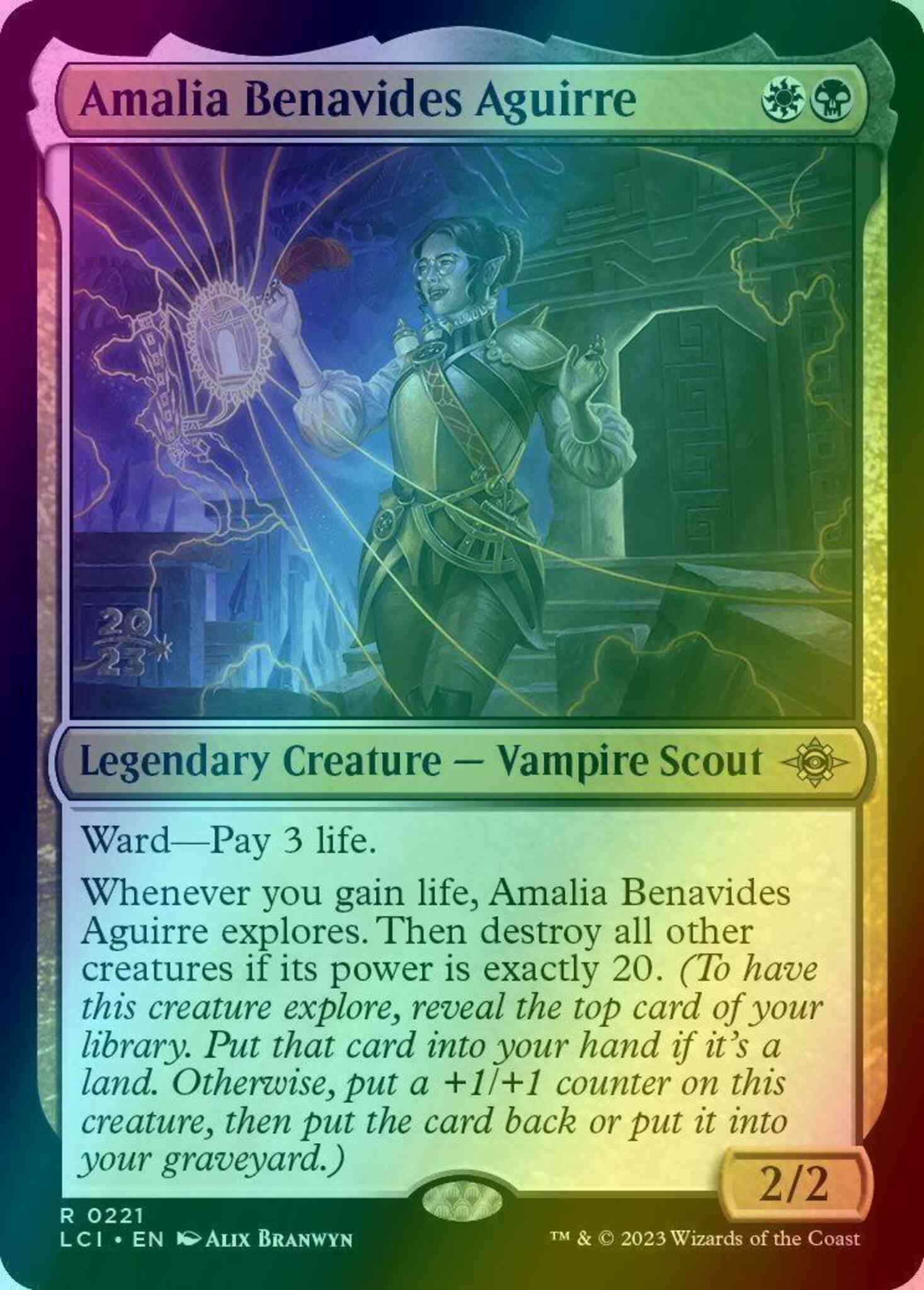 Whenever you gain life, Amalia Benavides Aguirre explores. Then, destroy all other creatures if its power is exactly 20. (To have this creature explore, reveal the top card of your library. Put that card into your hand if it's a land. Otherwise, put a +1/+1 counter on this creature, then put the card back or put it into your graveyard.)