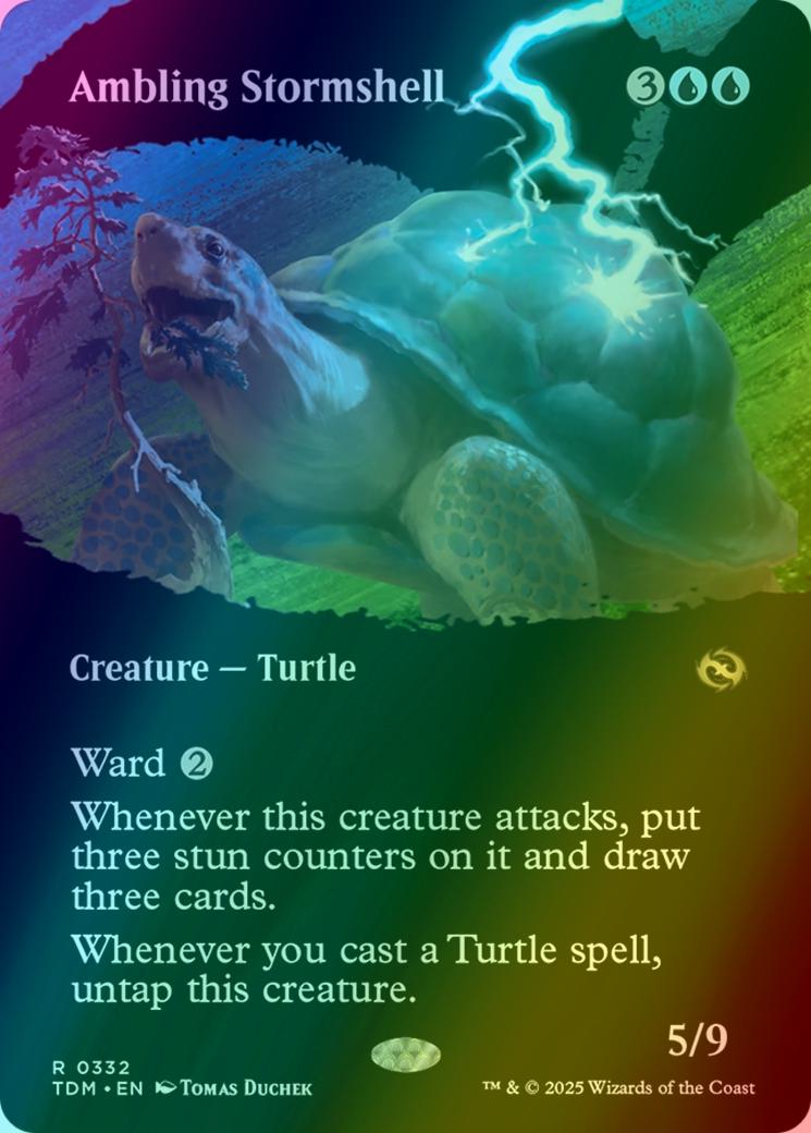 Ward {2} Whenever this creature attacks, put three stun counters on it and draw three cards. (If a permanent with a stun counter would become untapped, remove one from it instead.) Whenever you cast a Turtle spell, untap this creature.