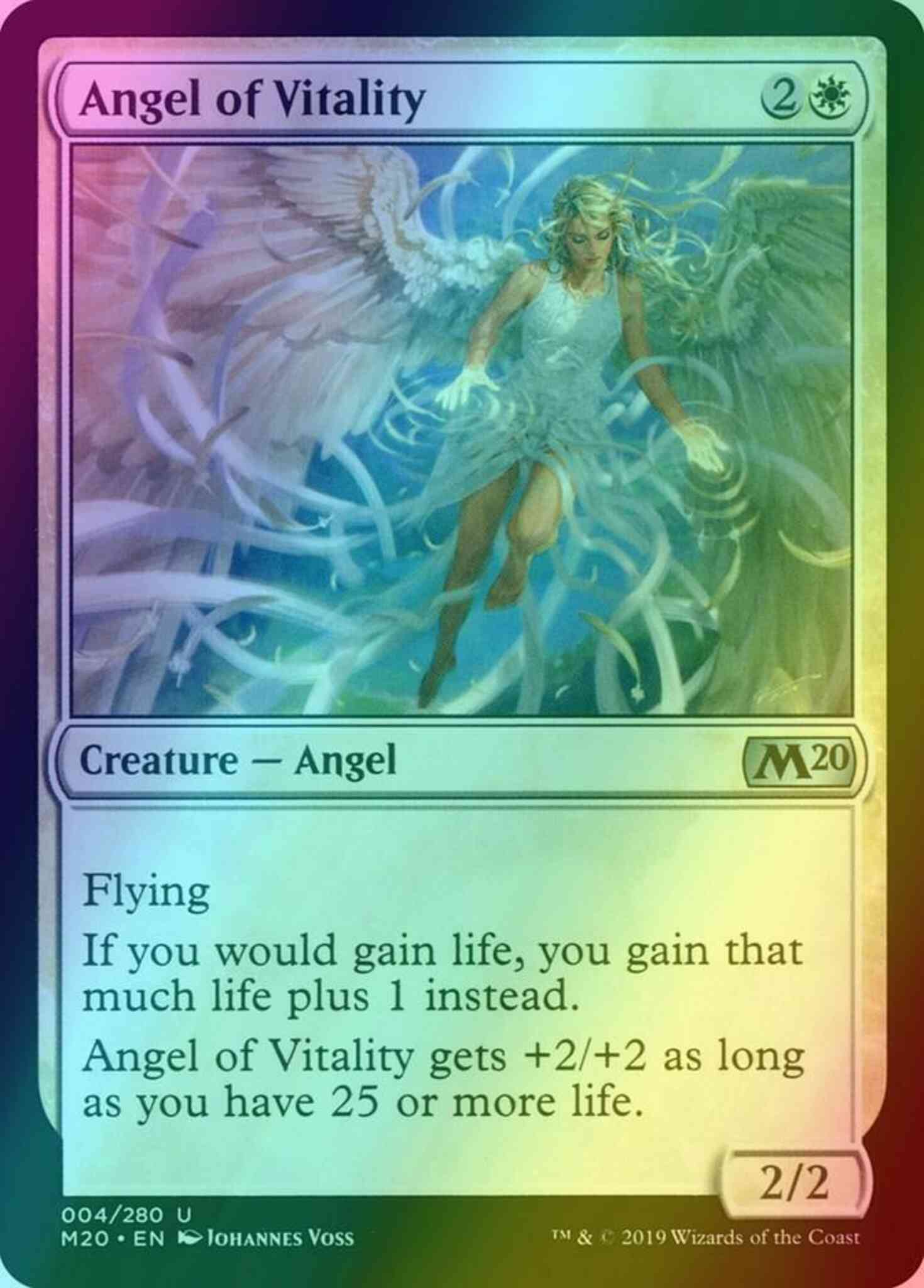 Card Text: Flying If you would gain life, you gain that much life plus 1 instead. Angel of Vitality gets +2/+2 as long as you have 25 or more life.