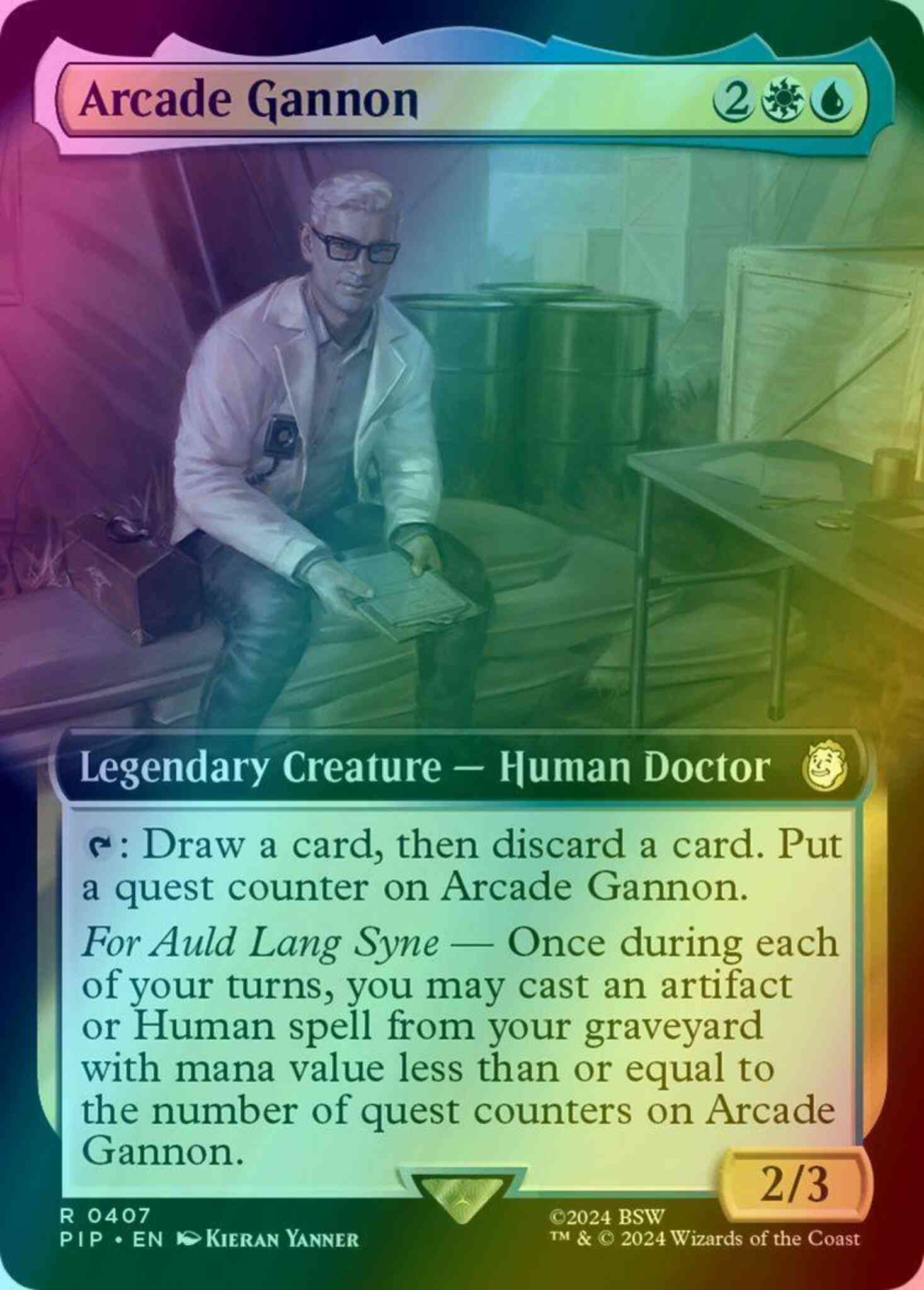 Card Text: {T}: Draw a card, then discard a card. Put a quest counter on Arcade Gannon. For Auld Lang Syne — Once during each of your turns, you may cast an artifact or Human spell from your graveyard with mana value less than or equal to the number of quest counters on Arcade Gannon.