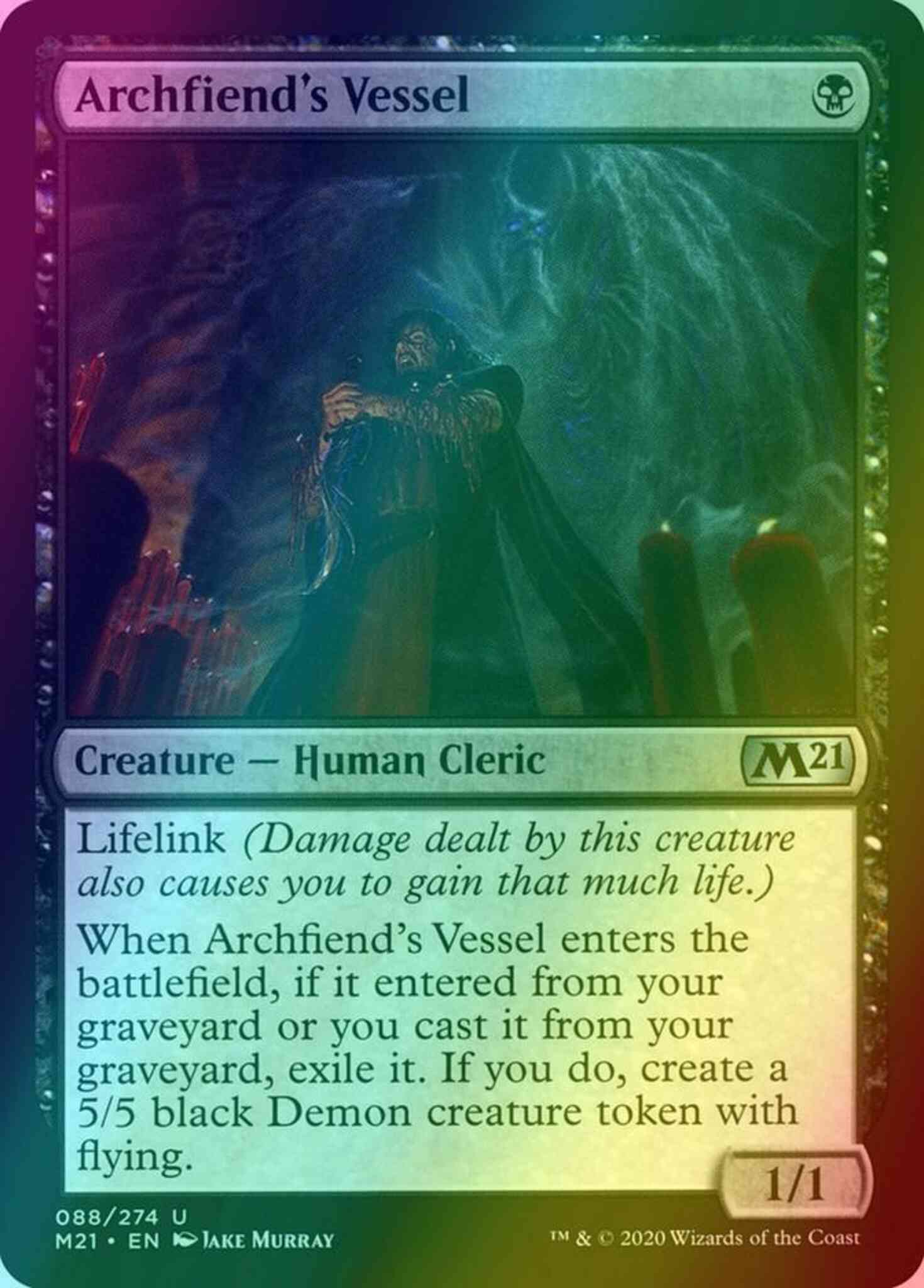 Card Text: Lifelink (Damage dealt by this creature also causes you to gain that much life.) When Archfiend's Vessel enters the battlefield, if it entered from your graveyard or you cast it from your graveyard, exile it. If you do, create a 5/5 black Demon creature token with flying.