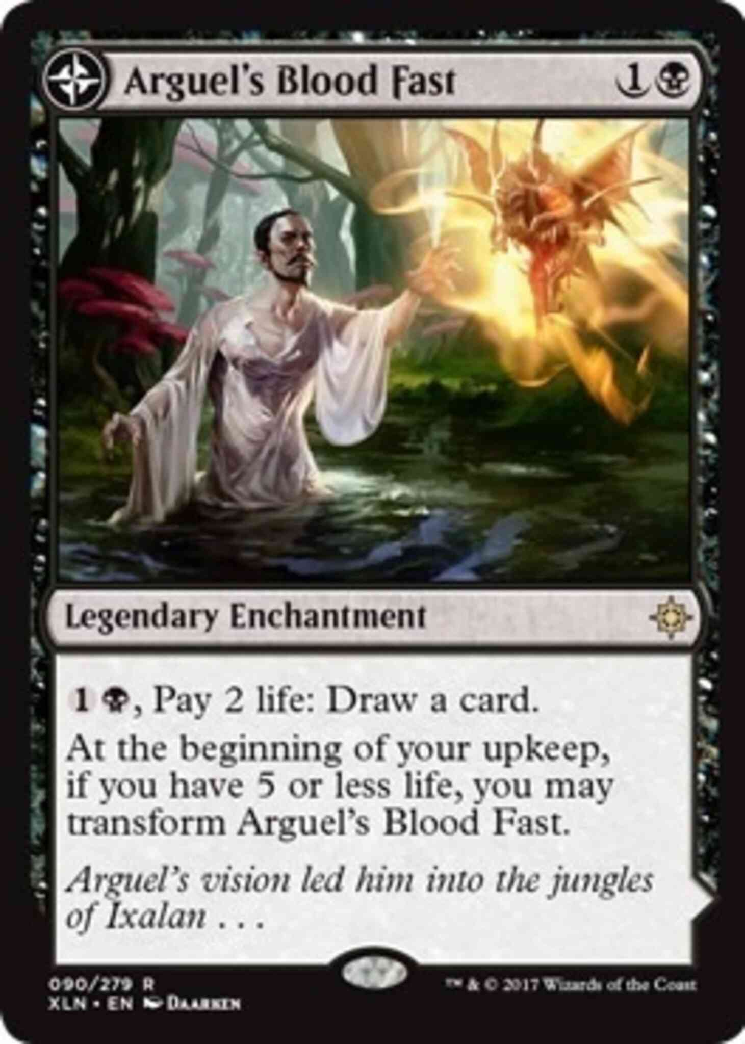 Card Text: {1}{B}, Pay 2 life: Draw a card. At the beginning of your upkeep, if you have 5 or less life, you may transform Arguel's Blood Fast.