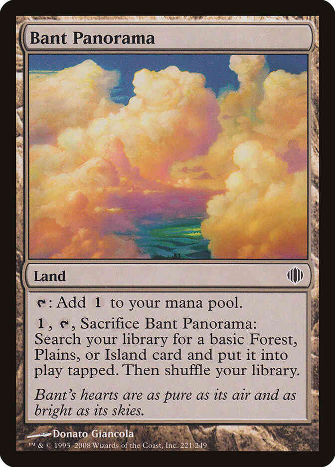 {1}, {T}, Sacrifice Bant Panorama: Search your library for a basic Forest, Plains, or Island card and put it onto the battlefield tapped. Then shuffle your library.