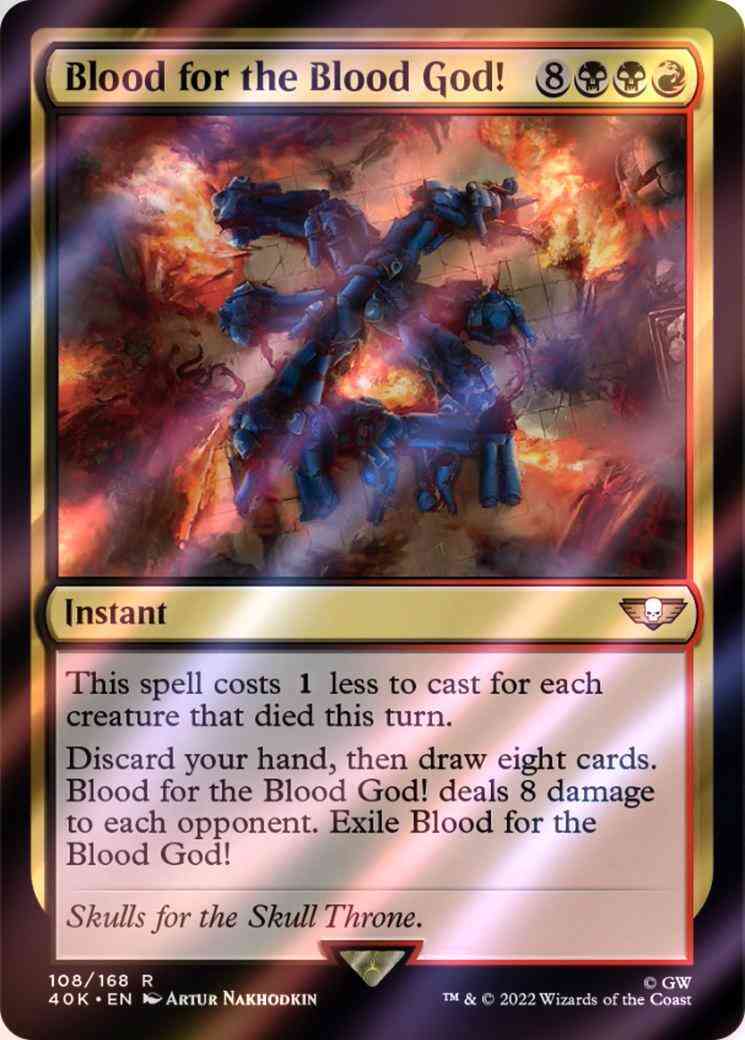 Discard your hand, then draw eight cards. Blood for the Blood God! deals 8 damage to each opponent. Exile Blood for the Blood God!