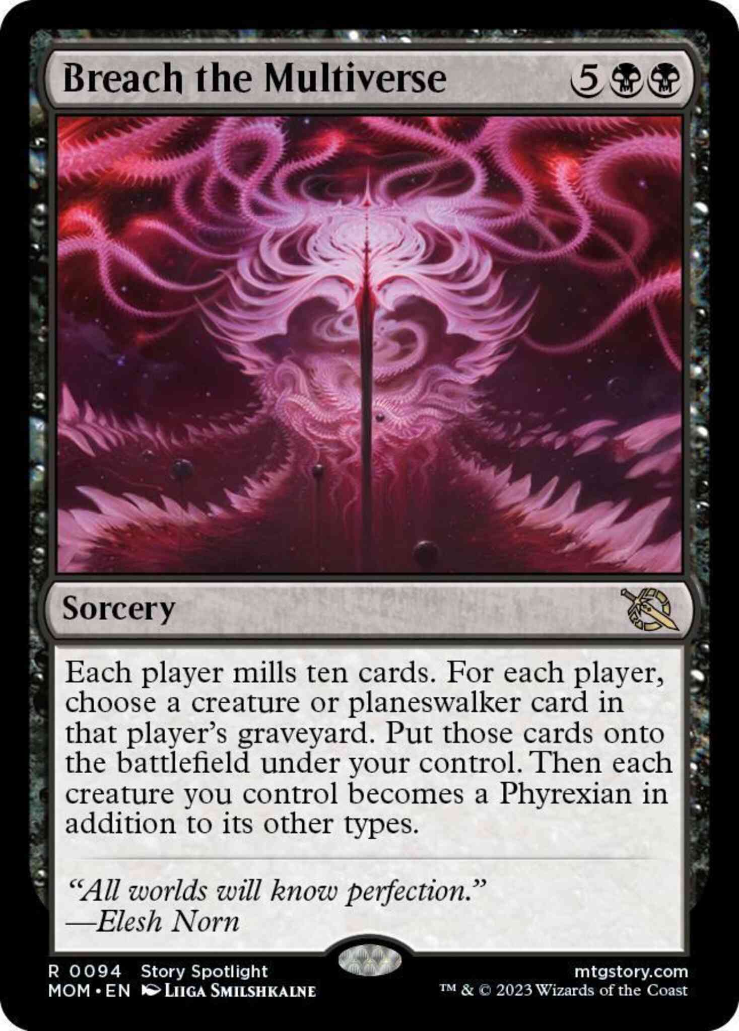 Each player mills ten cards. For each player, choose a creature or planeswalker card in that player's graveyard. Put those cards onto the battlefield under your control. Then each creature you control becomes a Phyrexian in addition to its other types.