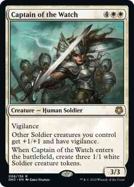 When Captain of the Watch enters the battlefield, create three 1/1 white Soldier creature tokens.