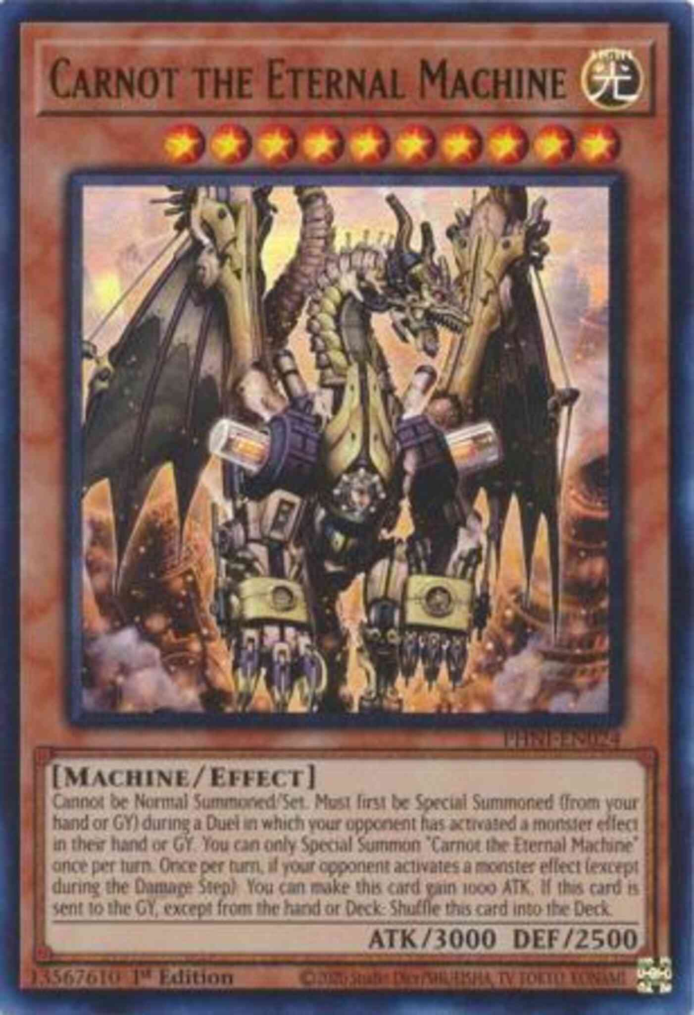 Card Text: Cannot be Normal Summoned/Set. Must first be Special Summoned (from your hand or GY) during a Duel in which your opponent has activated a monster effect in their hand or GY. You can only Special Summon "Carnot the Eternal Machine" once per turn. Once per turn, if your opponent activates a monster effect (except during the Damage Step): You can make this card gain 1000 ATK. If this card is sent to the GY, except from the hand or Deck: Shuffle this card into the Deck.