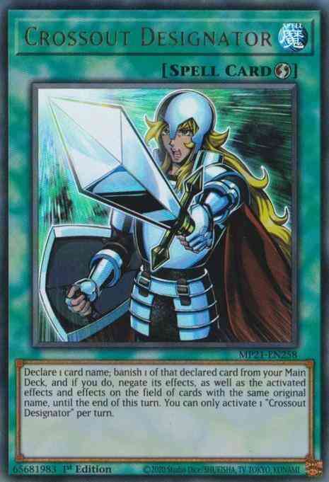 Declare 1 card name; banish 1 of that declared card from your Main Deck, and if you do, negate its effects, as well as the activated effects and effects on the field of cards with the same original name, until the end of this turn. You can only activate 1 "Crossout Designator" per turn.