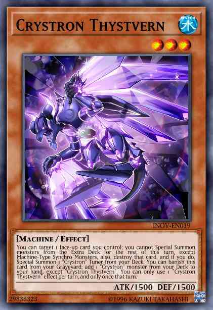 You can target 1 face-up card you control; you cannot Special Summon monsters from the Extra Deck for the rest of this turn, except Machine-Type Synchro Monsters, also, destroy that card, and if you do, Special Summon 1 "Crystron" Tuner from your Deck. You can banish this card from your Graveyard; add 1 "Crystron" monster from your Deck to your hand, except "Crystron Thystvern". You can only use 1 "Crystron Thystvern" effect per turn, and only once that turn.