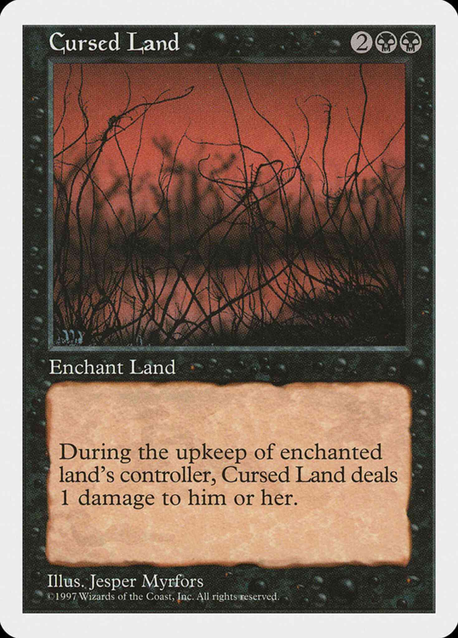 Card Text: Enchant land At the beginning of the upkeep of enchanted land's controller, Cursed Land deals 1 damage to that player.