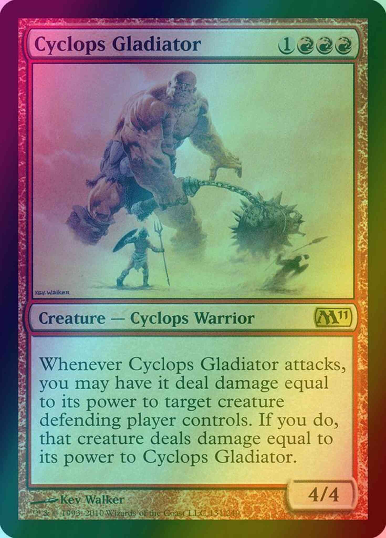 Whenever Cyclops Gladiator attacks, you may have it deal damage equal to its power to target creature defending player controls. If you do, that creature deals damage equal to its power to Cyclops Gladiator.