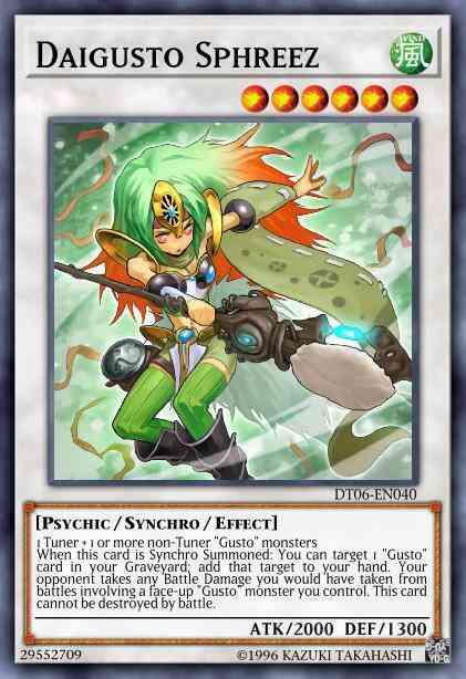 When this card is Synchro Summoned: You can target 1 "Gusto" card in your Graveyard; add that target to your hand. Your opponent takes any Battle Damage you would have taken from battles involving a face-up "Gusto" monster you control. This card cannot be destroyed by battle.