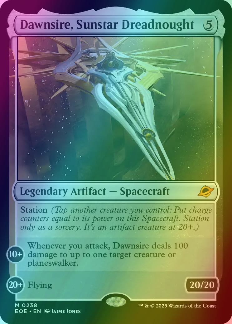 Station (Tap another creature you control: Put charge counters equal to its power on this Spacecraft. Station only as a sorcery. It's an artifact creature at 20+.) STATION 10+ Whenever you attack, Dawnsire deals 100 damage to up to one target creature or planeswalker. STATION 20+ Flying