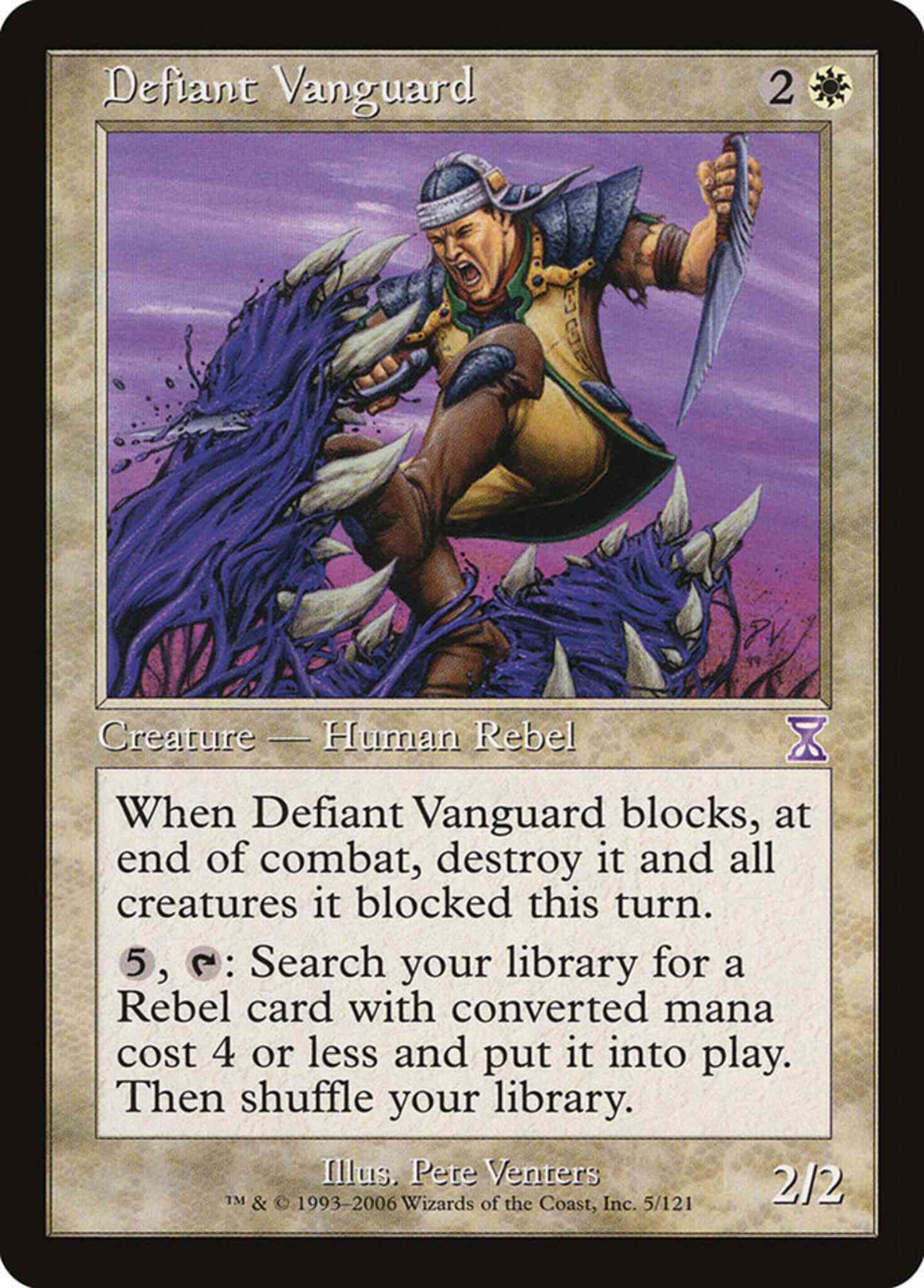 Card Text: When Defiant Vanguard blocks, at end of combat, destroy it and all creatures it blocked this turn. {5}, {T}: Search your library for a Rebel permanent card with converted mana cost 4 or less and put it onto the battlefield. Then shuffle your library.