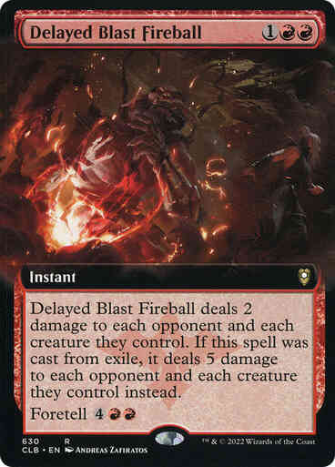 Card Text: Delayed Blast Fireball deals 2 damage to each opponent and each creature they control. If this spell was cast from exile, it deals 5 damage to each opponent and each creature they control instead. Foretell {4}{R}{R} (During your turn, you may pay {2} and exile this card from your hand face down. Cast it on a later turn for its foretell cost.)