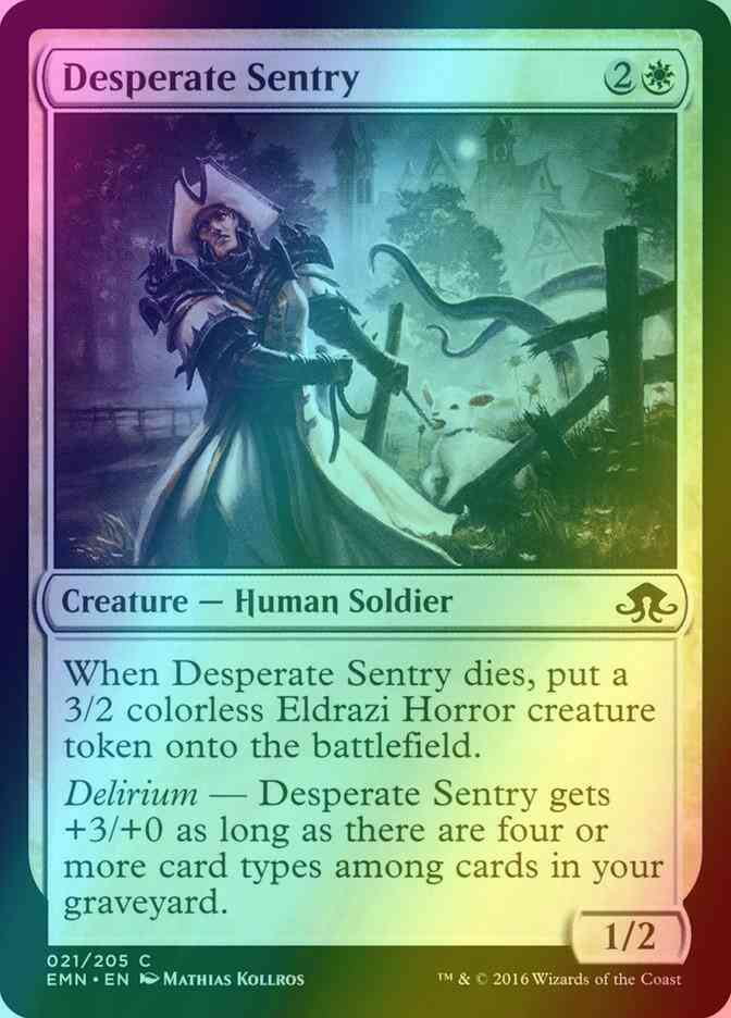 Card Text: When Desperate Sentry dies, create a 3/2 colorless Eldrazi Horror creature token. Delirium — Desperate Sentry gets +3/+0 as long as there are four or more card types among cards in your graveyard.