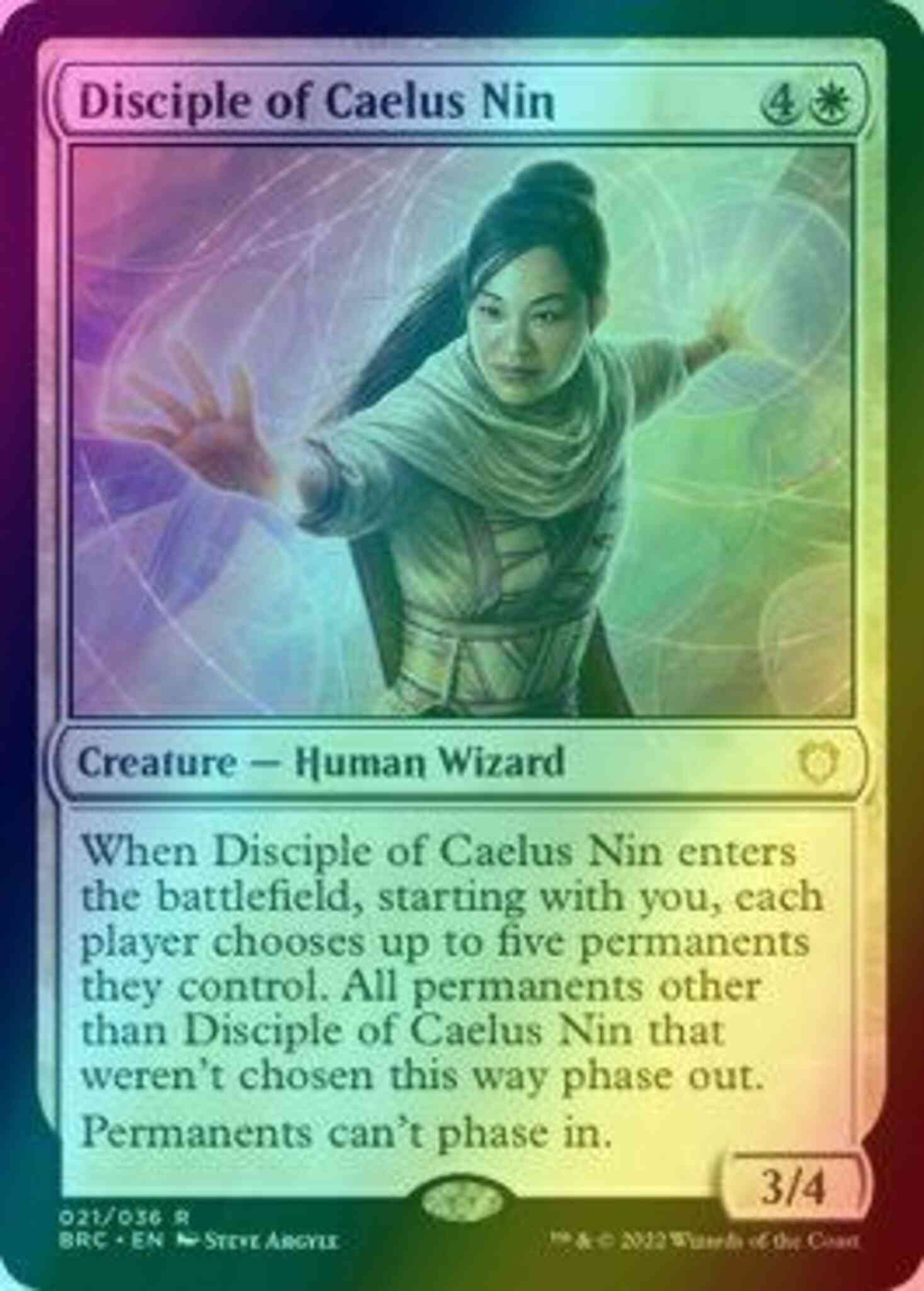 When Disciple of Caelus Nin enters the battlefield, starting with you, each player chooses up to five permanents they control. All permanents other than Disciple of Caelus Nin that weren't chosen this way phase out.