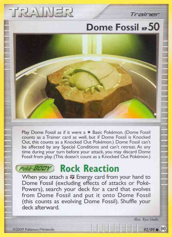 Play Dome Fossil as if it were a Colorless Basic Pokémon. (Dome Fossil counts as a Trainer card as well, but if Dome Fossil is Knocked Out, this counts as a Knocked Out Pokémon.) Dome Fossil can't be affected by any Special Conditions and can't retreat. At any time during your turn before your attack, you may discard Dome Fossil from play. (This doesn't count as a Knocked Out Pokémon.) When you attach a Fighting Energy card from your hand to Dome Fossil (excluding effects of attacks or Poké-Powers), search your deck for a card that evolves from Dome Fossil and put it onto Dome Fossil (this counts as evolving Dome Fossil). Shuffle your deck afterward.