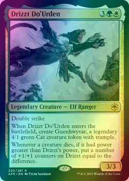 Card Text: Double strike When Drizzt Do'Urden enters the battlefield, create Guenhwyvar, a legendary 4/1 green Cat creature token with trample. Whenever a creature dies, if it had power greater than Drizzt's power, put a number of +1/+1 counters on Drizzt equal to the difference.