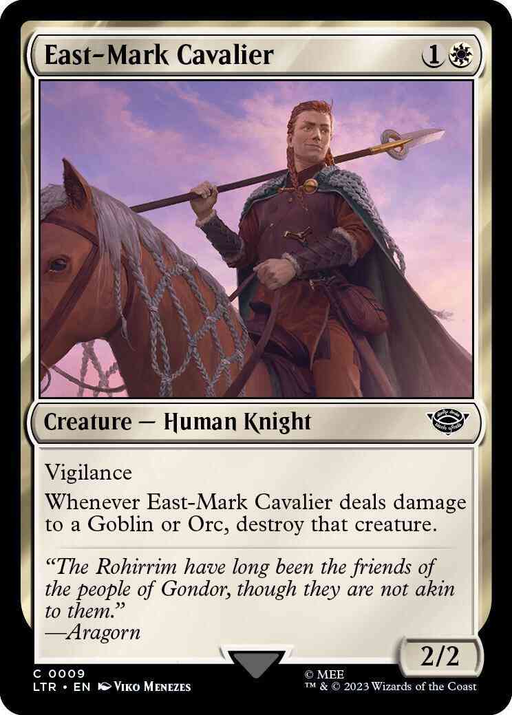 Whenever East-Mark Cavalier deals damage to a Goblin or Orc, destroy that creature.