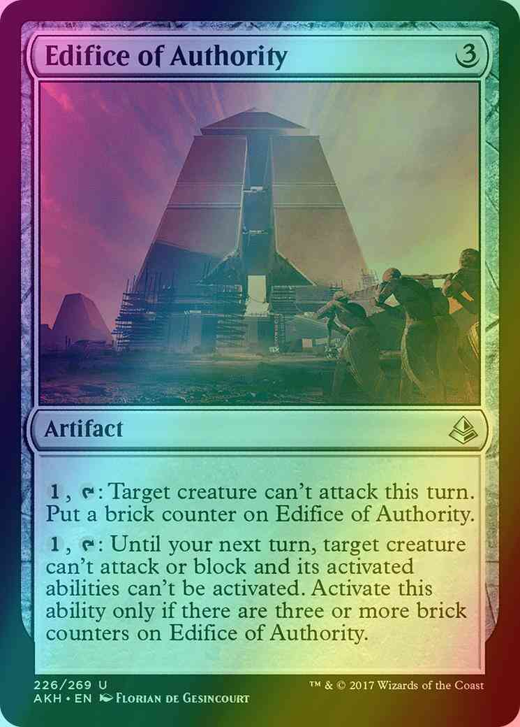 Card Text: {1}, {T}: Target creature can't attack this turn. Put a brick counter on Edifice of Authority. {1}, {T}: Until your next turn, target creature can't attack or block and its activated abilities can't be activated. Activate this ability only if there are three or more brick counters on Edifice of Authority.