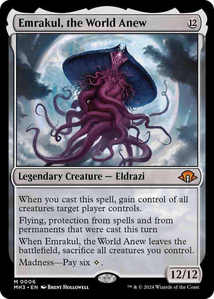 When you cast this spell, gain control of all creatures target player controls. Flying, protection from spells and from permanents that were cast this turn When Emrakul, the World Anew leaves the battlefield, sacrifice all creatures you control. Madness—Pay six {C}.