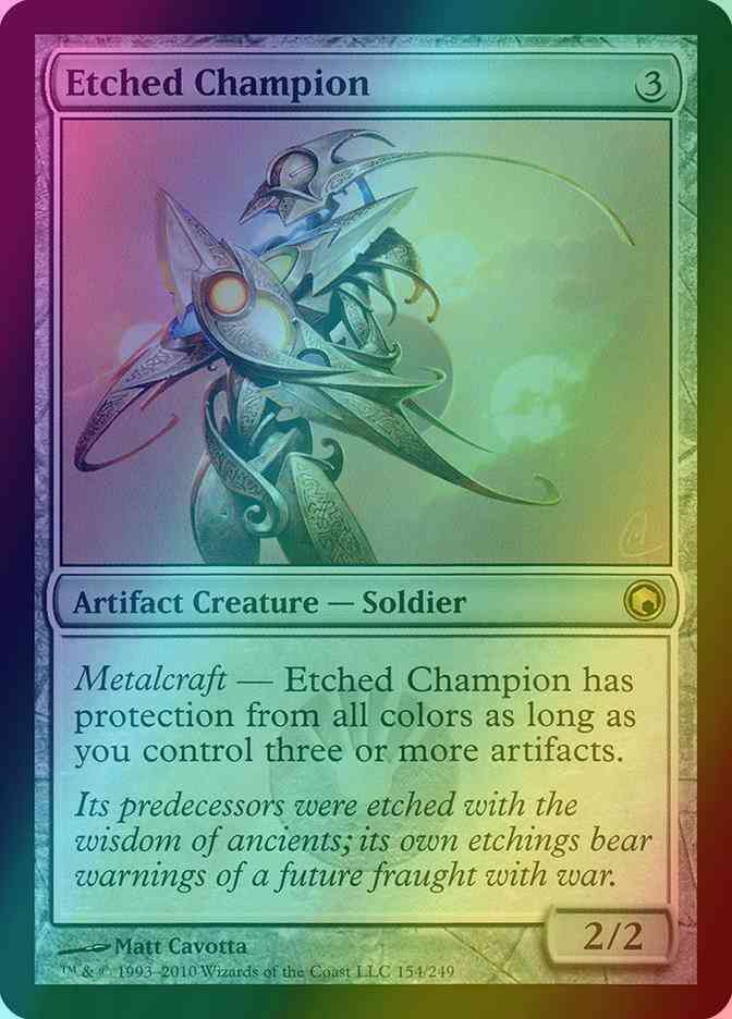 Card Text: Metalcraft — Etched Champion has protection from all colors as long as you control three or more artifacts.